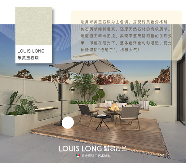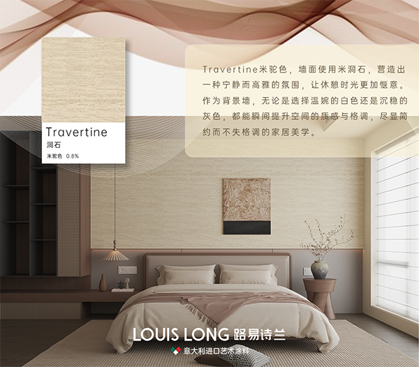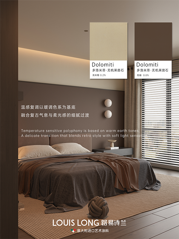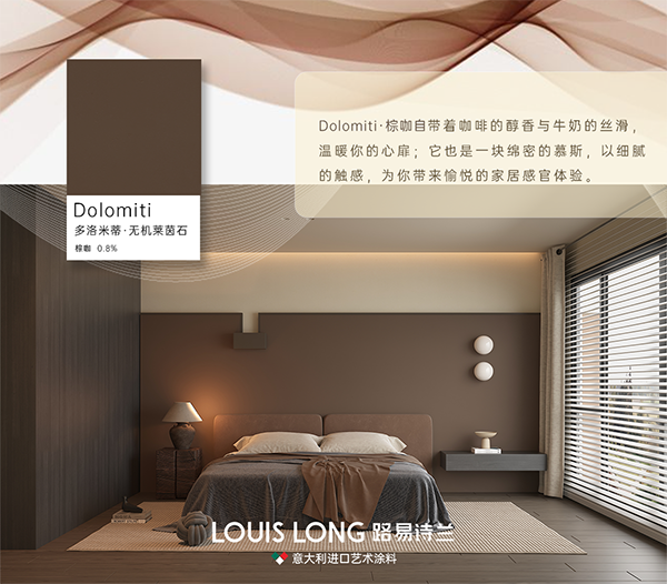 深系美拉德色彩以深棕咖色和洞石-米驼色为主,巧妙搭配米黄玉石漆和Dolomiti·多洛米蒂-浅米橙,创造出高级、典雅和复古的氛围。