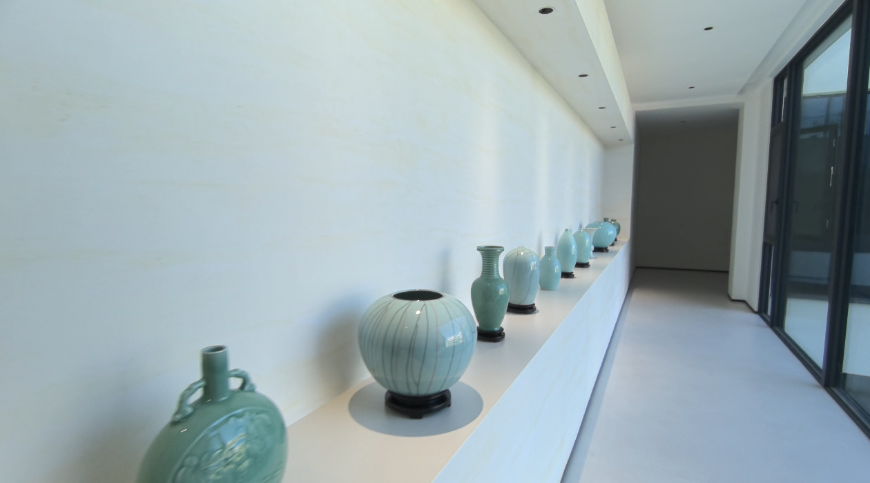洞石的哑光质感弱化反光,使展厅灯光更聚焦于青瓷的釉色变化。